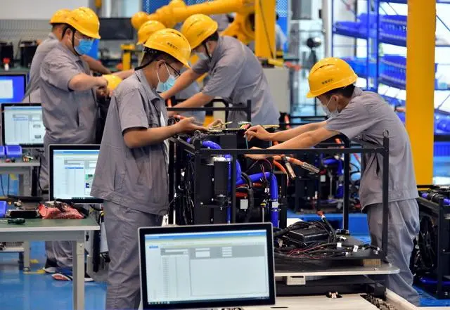 7月12日,天津滨海新区临港经济区智能装备园的氢燃料电池发动机装配线。摄影/章轲